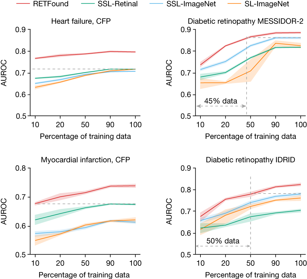 图像中不同颜色曲线代表不同模型的AUROC,95%置信区间,中心代表AUROC平均值。数据显示,在利用CFP图像预测心力衰竭和心肌梗死3年发病率两项任务中,RETFound仅使用10%数据量,其表现就优于对照组模型。而在糖尿病视网膜病变相关的数据集MESSIDOR-2和IDRID上,RETFound仅使用45%和50%的数据量,模型表现即可超越对照组模型。