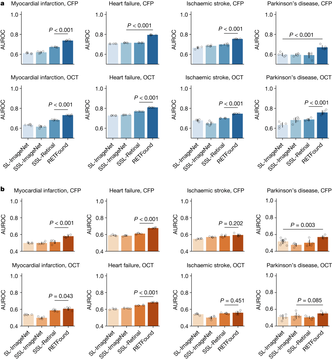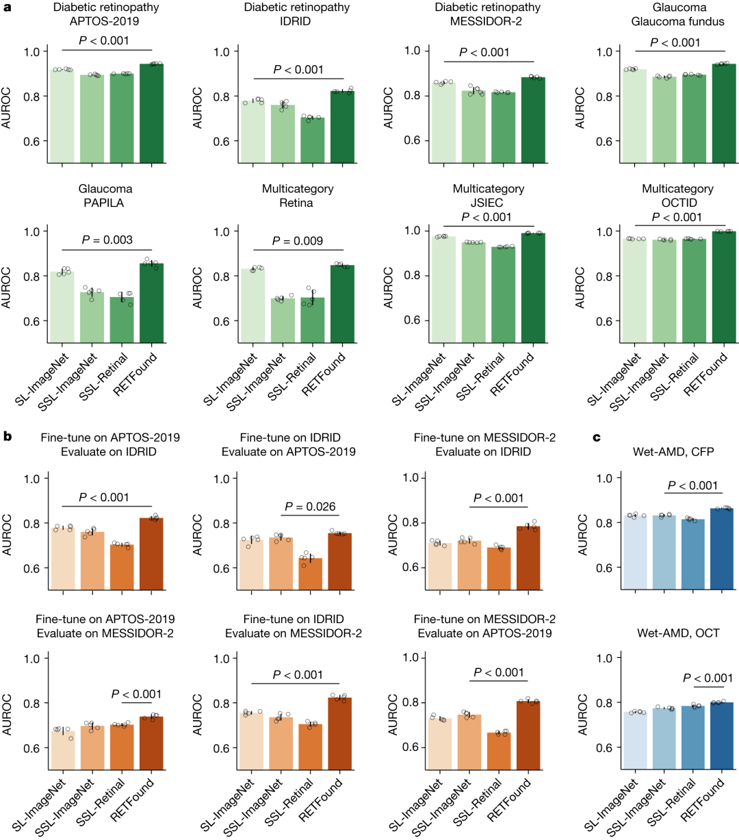 此外,科学家使用接收者操作曲线下面积(area under the receiver operating curve,AUROC)和精确召回曲线下面积(area under the precision-recall curve,AUPR)来报告模型性能;同时使用RETFound和每个任务中最具竞争力的比较模型之间的双边t检验来计算P值,以检查模型的显著性。