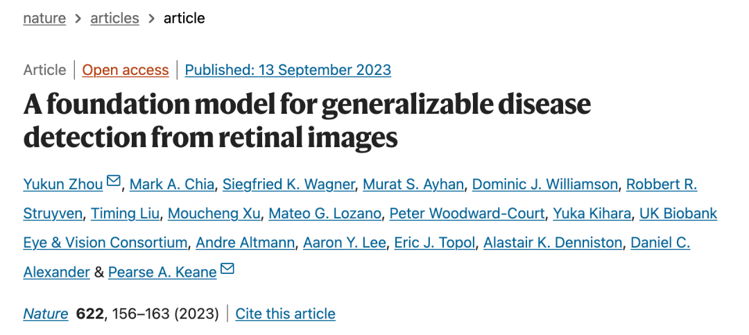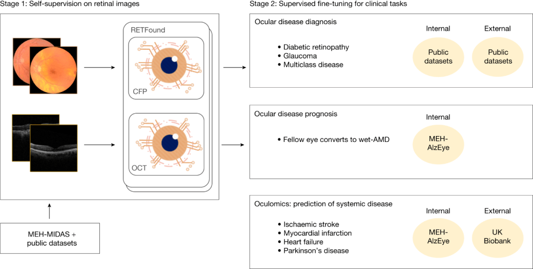 近日,在nature杂志上发表的一篇研究介绍了基础模型RETFound——一个针对视网膜图像的大模型。RETFound能从未标记的视网膜图像中学习可泛化的表征,具体而言,RETFound通过自监督学习的方法在160万张未标记的视网膜图像上进行训练,然后通过微调来适应具有明确标记的疾病检测任务。