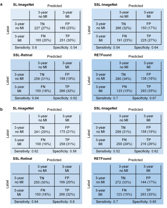▷表1.心肌梗死3年预测的匹配矩阵。a,CFP的混淆矩阵。b,OCT的混淆矩阵。RETFound较其他模型显示出最高的敏感性和特异性。表源:论文
