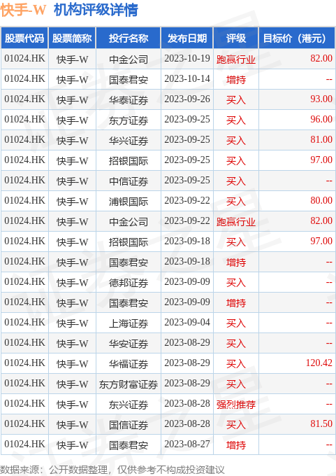 截至2023年10月19日收盘,快手-W(01024.HK)报收于56.1港元,上涨0.09%,换手率0.73%,成交量2620.2万股,成交额14.74亿港元。投行对该股的评级以买入为主,近90天内共有47家投行给出买入评级,近90天的目标均价为87.86港元。中金公司最新一份研报给予快手-W跑赢行业评级,目标价82港元。