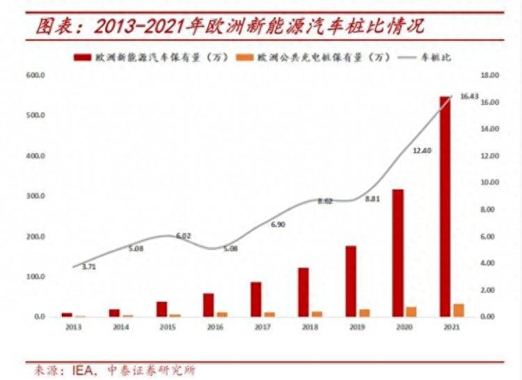 随着中国新能源产业和新能源汽车的井喷式崛起和能源危机影响,新能源车在欧洲迅速普及,部分国家当年渗透率超过80%。但在新能源车保有率越来越高的情况下,欧洲的充电服务却止步不前。近五年来,欧洲新能源车与公共充电桩比例不降反升,从6.9:1一直抬高到16.4:1,缺口和服务不断扩大。