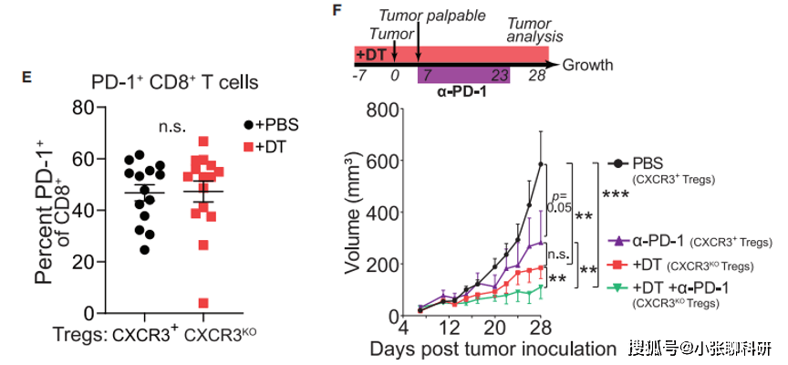 进一步,研究人员对上述发现的治疗意义进行了探究,他们发现Treg特异性CXCR3缺陷与抗PD-1检查点阻断免疫疗法相结合,会显著抑制肿瘤进展。