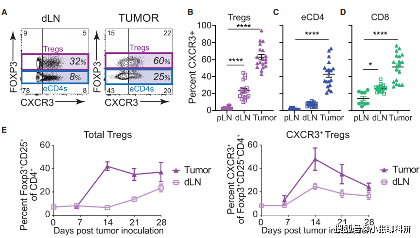 他们发现在结肠癌、胸腺淋巴瘤、神经母细胞瘤等肿瘤模型中CXCR3在Treg细胞上的表达随着肿瘤的临近而增加,CXCR3+Treg在外周淋巴结中的表达可以忽略不计,但CXCR3+Treg细胞在肿瘤引流淋巴结和肿瘤中的表达比例增加。