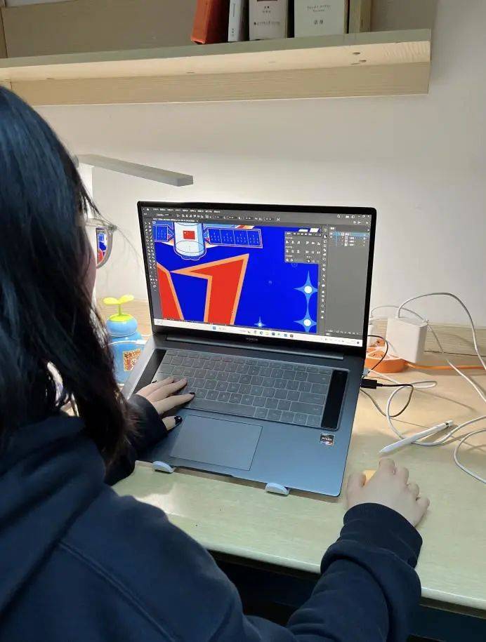 在神舟十七号载人飞行任务标识设计过程中,我将“星空”“地球”“空间站”以及“飞船尾焰”作为标识中的主要元素。为了能够更加准确地表达任务及空间站构型特征,我在指导教师团队的帮助下,系统梳理了空间站从建造到完成的历次构型变化,也渐渐熟悉了飞船与空间站的对接关系,最终,我能够通过直观的图形语言展示神舟十七号载人飞船发射后与空间站天和核心舱的前向端口对接,并形成三舱三船组合体的状态。