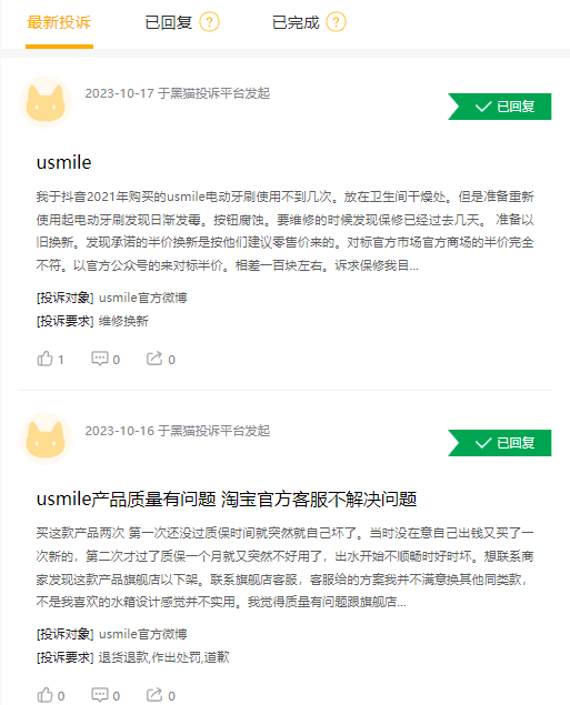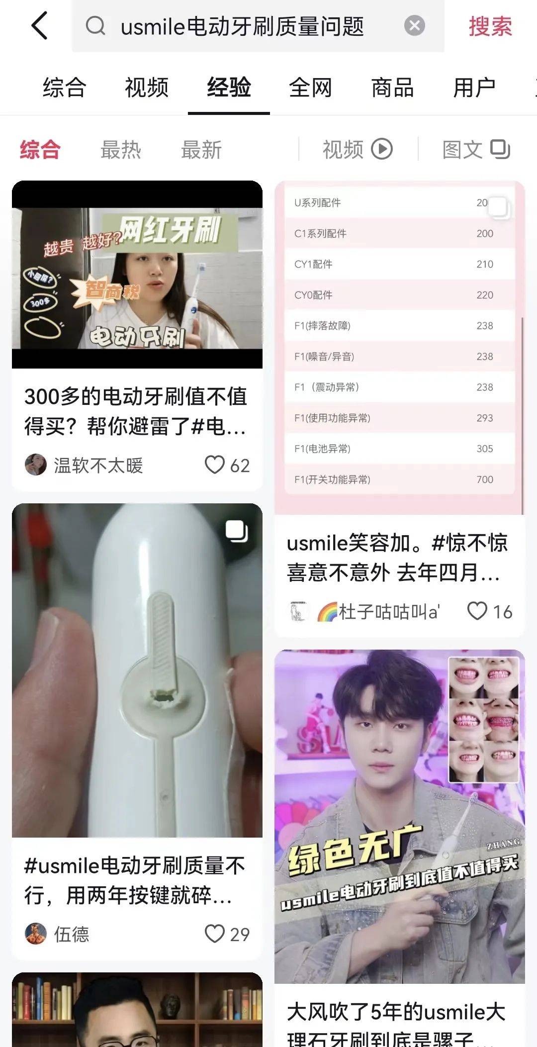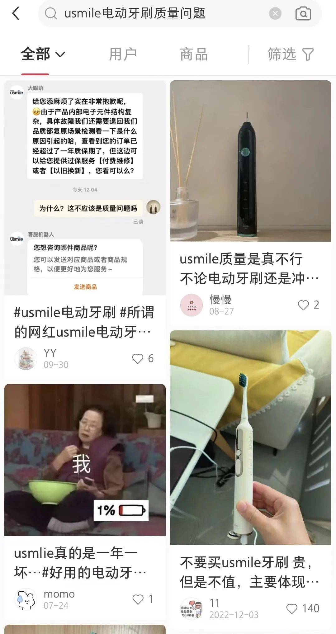 如此一来,代工厂生产的产品就容易出现质量不合格的情况。「界面新闻·创业最前线」注意到,抖音、小红书、黑猫投诉等诸多平台均出现了网友对usmile产品质量问题的控诉。