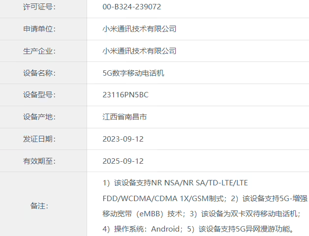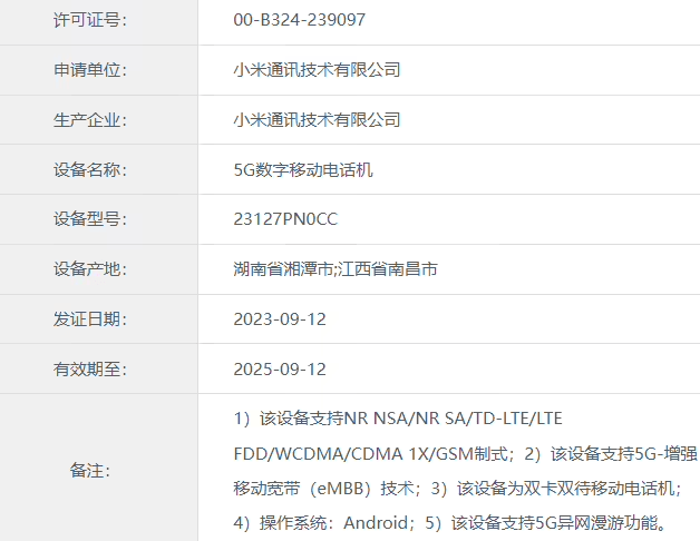 据工信部显示,日前有两款型号分别为 23127PN0CC、23116PN5BC 的小米新机,在工信部完成了入网。