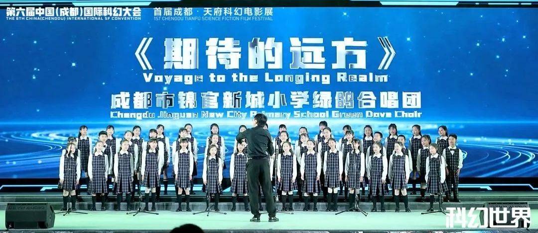 开场伊始,来自成都市锦官新城小学的绿鸽合唱团带来了一首童声合唱《期待的远方》,作为“中国科幻之都”成都的未来之星,他们用歌声表达出对全球科幻大咖的欢迎。