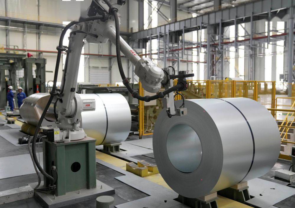 ↑10月19日,河钢浦项汽车板合资项目生产线上的机器人在给成品钢板喷产品代码。