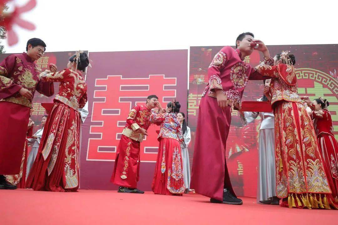 婚礼仪式上,新人们身着喜庆的红色中式礼服依次登场,他们循古礼、尊传统,在父母亲友、广大父老乡亲的共同见证下,进行了跨火盆、跨马鞍、读婚书、行结发礼、喝交杯酒等一系列中式传统婚礼仪式,以中国人特有的浪漫方式诠释爱情与承诺。