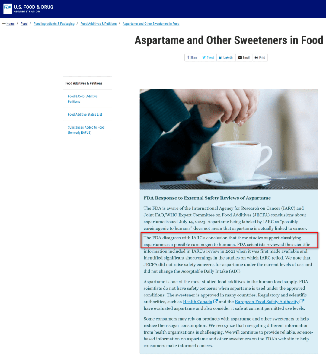 美国FDA则直接回应称:我们(FDA)不同意国际癌症研究机构(IARC)将阿斯巴甜归类为可能对人类致癌物质的结论。