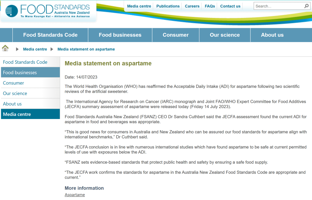 [6]Media statement on aspartame (foodstandards.gov.au)