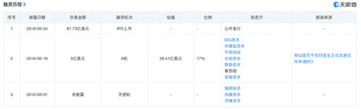 也是在这一阶段,平安健康(平安好医生)在港上市,天眼查APP融资信息显示,曾经IDG资本、高榕资本等多家机构都参与过该项目的融资。