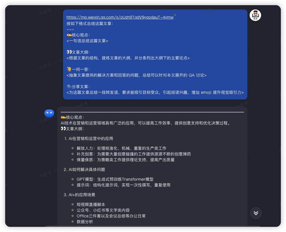 非常简单,用 AI 对公众号文章进行总结概括,要求它输出。