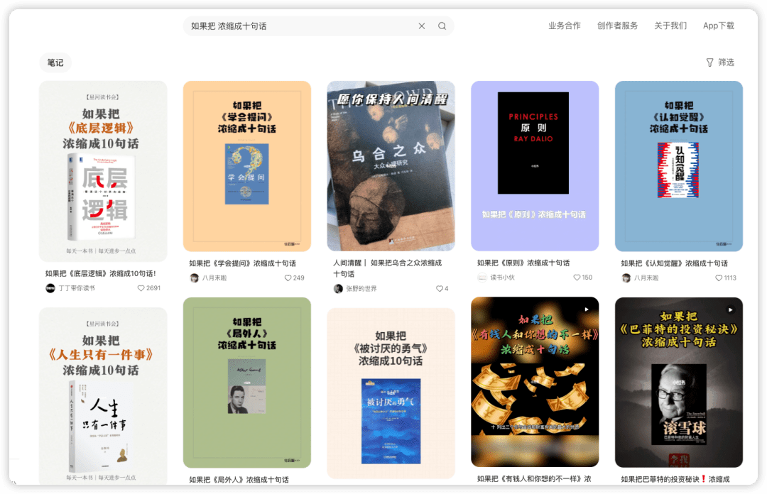你去小红书搜一搜“浓缩成十句话”,全是拆书的,老火了。