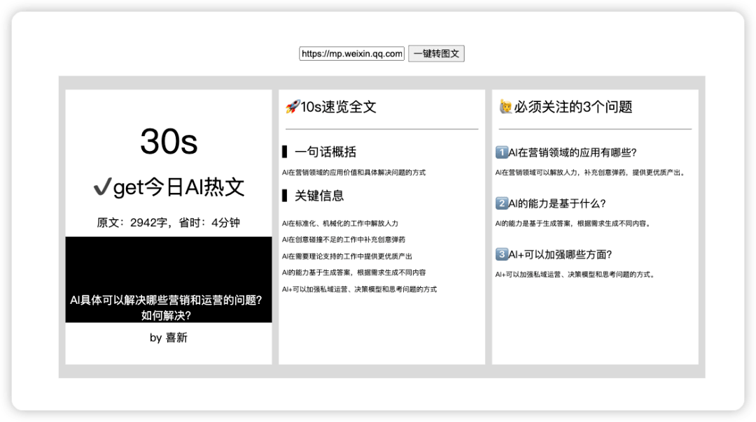 它的功能是,输入一篇公众号的文章,直接生成一张封面图+一张文章速览+文章问答,操作流程: