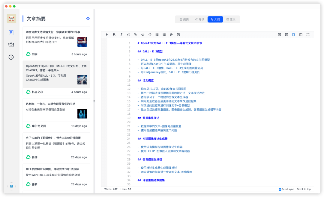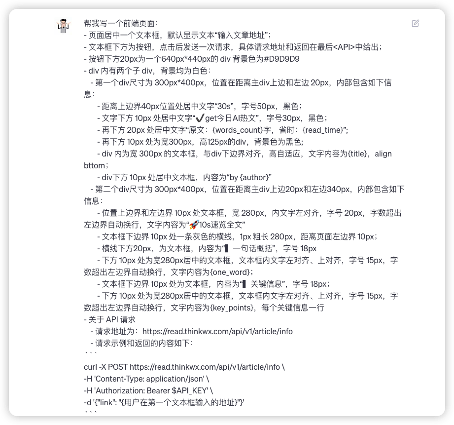 如开头所言,除了生成文章一句话介绍,还可以做文章大纲呈现,它的逻辑跟我演示的这个一样。因为知了阅读的 API 接口也可以生成文章大纲,是 Markdown 格式的。