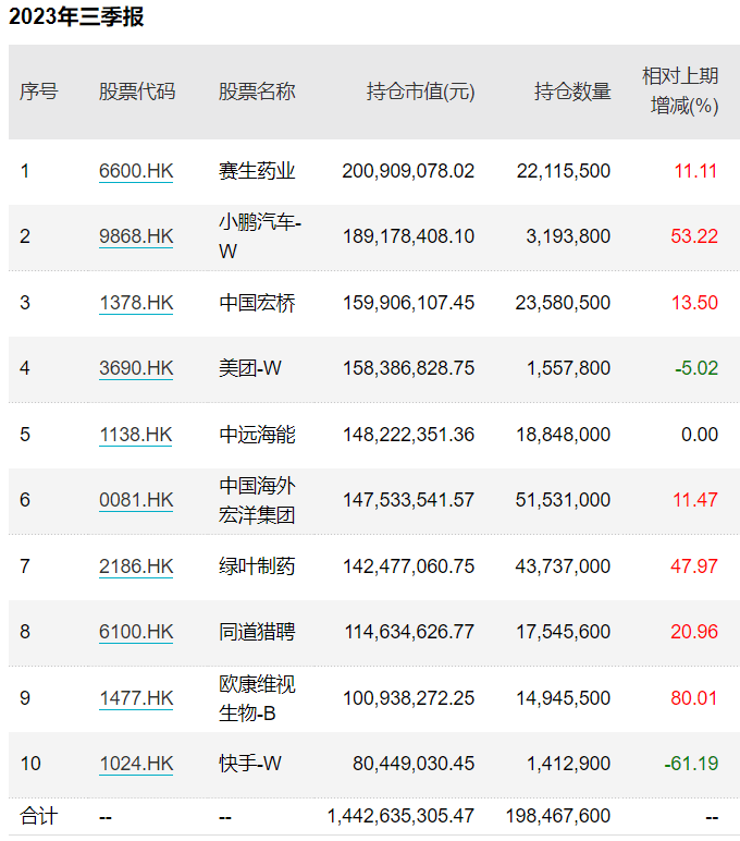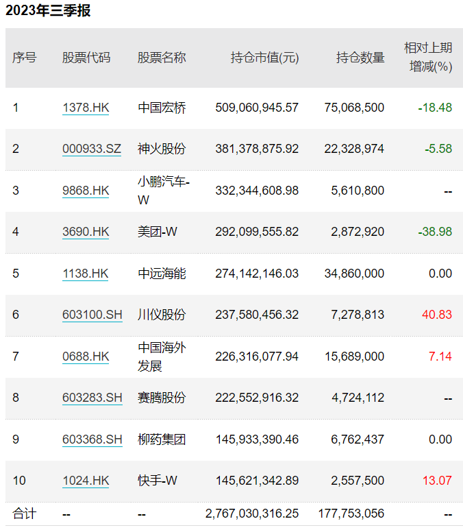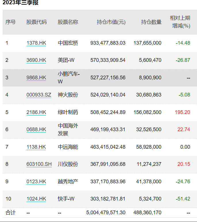 首先,来看管理时间最早的,、驰宏锌锗退出前十大,小鹏汽车-W、绿叶制药新进前十大,减持了神火股份、中国宏桥、美团-W、快手-W、越秀地产,加仓了中国海外发展、。