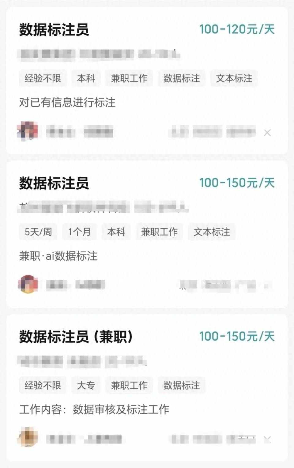 在互联网招聘平台上,不少公司发布的对兼职数据标注员招聘信息中,也要求应聘者具有本科学历,工作地点在一、二线城市,日薪在100-250元/天不等。