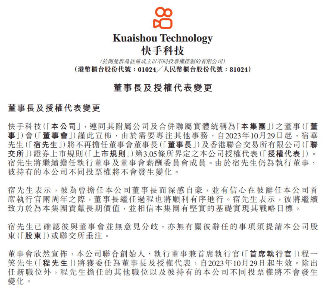 在两年前辞去CEO之后,快手联合创始人宿华再次辞任董事长一职,辞任后将由CEO程一笑兼任董事长,该调整将于2023年10月29日生效。