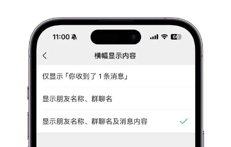 【微信消息新增横幅显示内容】微信对消息弹窗进行了升级优化,在微信打开聊天页面、朋友圈时也能收到新消息显示了。打开微信,点击「我」-「设置」-「消息通知」,可以看到新增了「横幅显示内容」选项。有3种内容显示形式,分别为:仅显示你收到1条消息;显示朋友名称、群聊名;显示朋友名称、群聊名及消息内容。iOS系统升级至微信版本8.0.42后可设置该功能,安卓系统需再等等。(澎湃新闻)