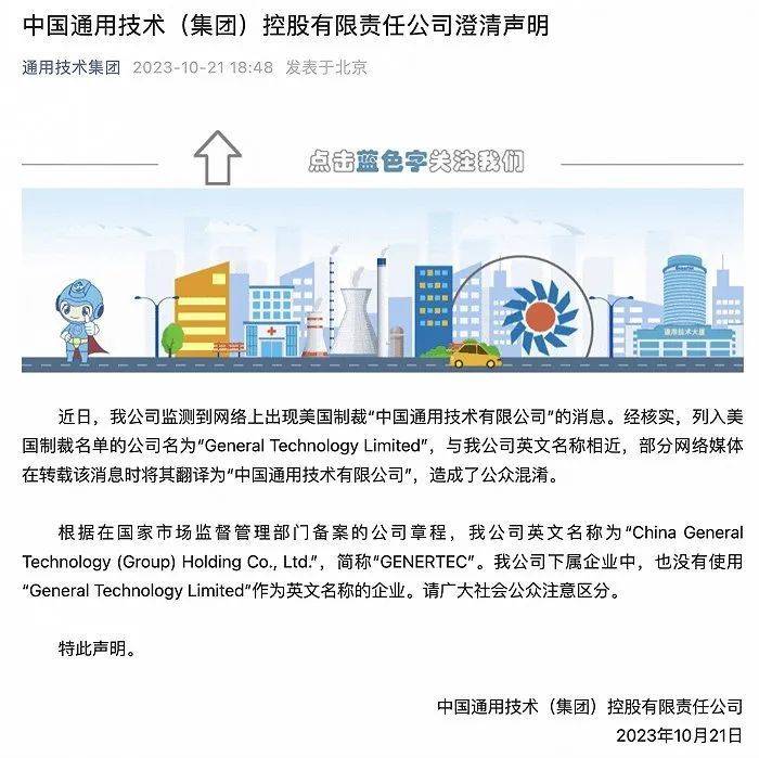 【“中国通用技术有限公司”被美国制裁?公司澄清:媒体转载时翻译造成公众混淆】10月21日,中国通用技术(集团)控股有限责任公司发布澄清声明称,近日,我公司监测到网络上出现美国制裁“中国通用技术有限公司”的消息。经核实,列入美国制裁名单的公司名为“General Technology Limited”,与我公司英文名称相近,部分网络媒体在转载该消息时将其翻译为“中国通用技术有限公司”,造成了公众混淆。根据在国家市场监督管理部门备案的公司章程,我公司英文名称为“China General Technology (Group) Holding Co., Ltd.”,简称“GENERTEC”。我公司下属企业中,也没有使用“General Technology Limited”作为英文名称的企业。(新浪财经)
