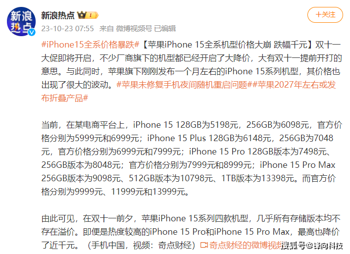 这个负面消息就是“iPhone15全系价格暴跌”,产生于10点30左右。然后迅速就登上热搜,一度排名第一。截至发稿前该话题的浏览量已经突破1.5亿,参与讨论者超过4500人。目前该话题排名第二位。足以见大家对于iPhone 15系列的关注程度有多高,苹果的影响力有多大。不过个话题苹果是打死都不愿看到的,因为iPhone 15系列正式商用这才足月,一个月时就出现这样的降价现象,这对于未来iPhone 15系列在国内的销量是极为不利的。