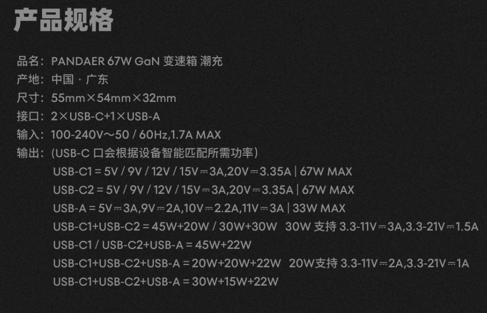 此外,该产品采用可折叠插脚设计,全面压缩充电器体积,还支持过流保护、过压保护、过温保护、低电磁干扰、短路保护、耐静电保护等安全功能。