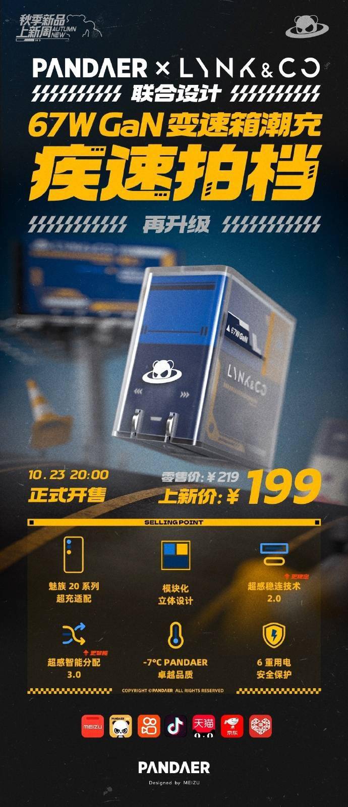 IT之家 10 月 23 日消息,魅族旗下品牌 PANDAER 今日宣布推出 PANDAER × Lynk & Co 67W 变速箱潮充・疾速拍档,该充电器产品与领克汽车联名设计,采用经典蓝黄撞色涂装,到手价 199 元,今晚 8 点在各电商平台开售。