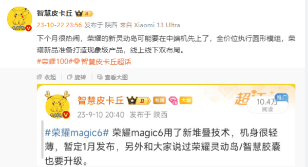 【手机中国新闻】现在的手机厂商在更新节奏上都非常快,以荣耀手机为例,按照时间节奏来看,数字类型一年两代更新,基本都是上半年一款,下半年一款。10月23日,手机中国注意到,有数码博主爆料称,下个月手机市场会很热闹,荣耀的新灵动岛可能会先给中端机搭载,全价位配备圆形模组。博主还称,荣耀新品准备打造现象级产品,线上线下双布局。
