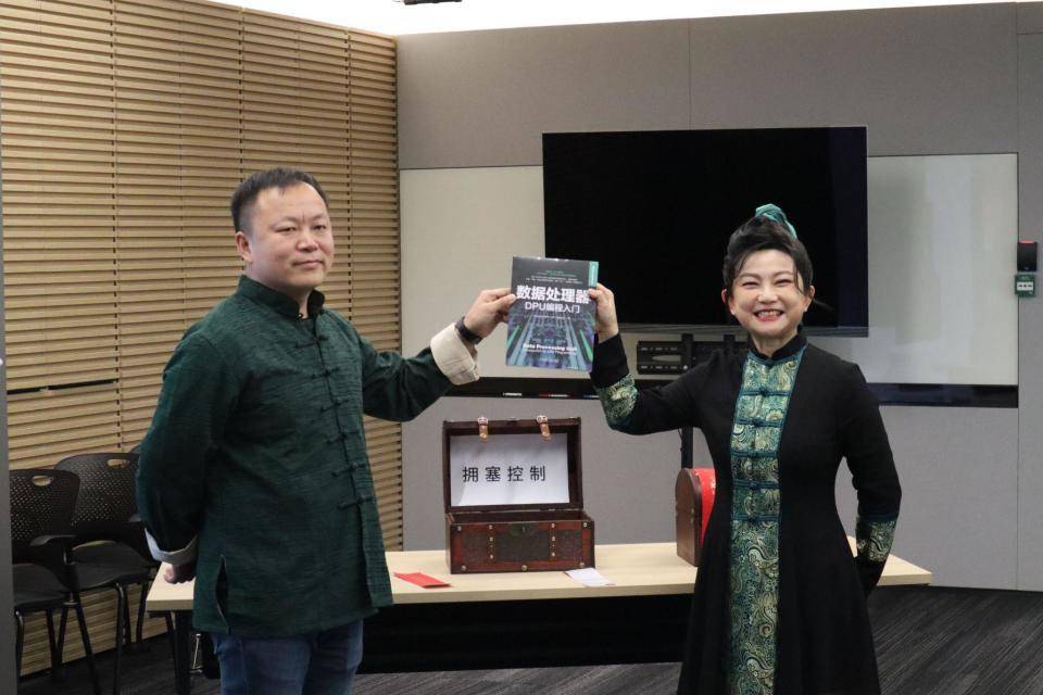 2023年10 月 17 日,在“揭开AI背后的武林秘籍”发布会现场,NVIDIA全球副总裁,中国企业营销负责人刘念宁和NVIDIA中国区工程和解决方案高级总监赖俊杰分别身着绿色武侠装,在台上正式揭晓了三只宝箱中封存的秘籍——《数据处理器:DPU编程入门》。