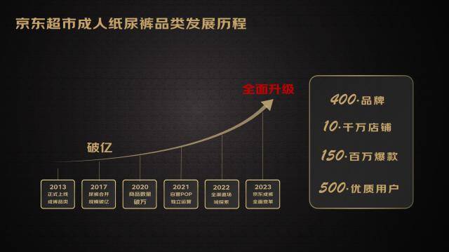 自2013年上线运营以来,京东超市成人纸尿裤品类历经10年的发展,已有400多个品牌,10个千万级店铺,150个百万单品以及500万优质用户,已成为9大成人纸尿裤品牌、50款品牌单品的国内最大零售商。