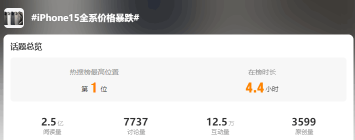 10月23日上午,#iPhone15全系价格暴跌# 冲上社交媒体平台热搜榜首。截至15时,该话题阅读量已突破2.5亿,讨论数超过7000条,互动量超过12.5万。对此,部分网友表示,“降价不错,但是我选华为。”