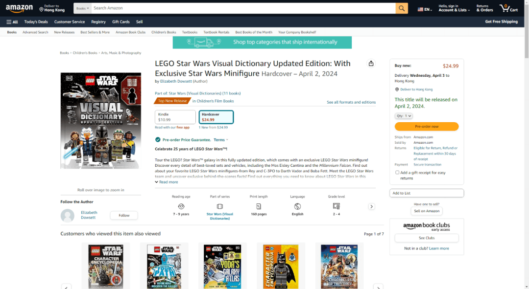 美国的线上购物平台亚马逊最近公布了备受星战粉丝期待的DK新书《乐高星球大战视觉词典》 2024更新版(LEGO Star Wars Visual Dictionary Updated Edition: With Exclusive Star Wars Minifigure Hardcover – April 2, 2024),并设立了单独的产品页面和清单信息,该图书预计将于明年4月份上市。