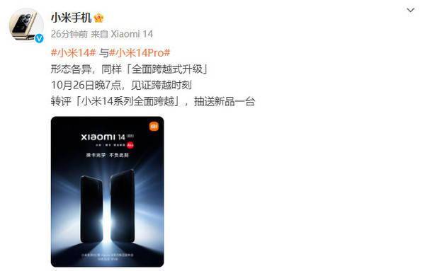 【手机中国新闻】小米14系列定档10月26日19点发布。随着发布时间临近,小米官方也逐渐公布了更多新机的信息为发布会预热。10月24日,小米手机官方放出了小米14系列全新海报图。海报展示了小米14和小米14 Pro的形态,为一大一小。同时经过处理后,还能看见小米14系列的设计。
