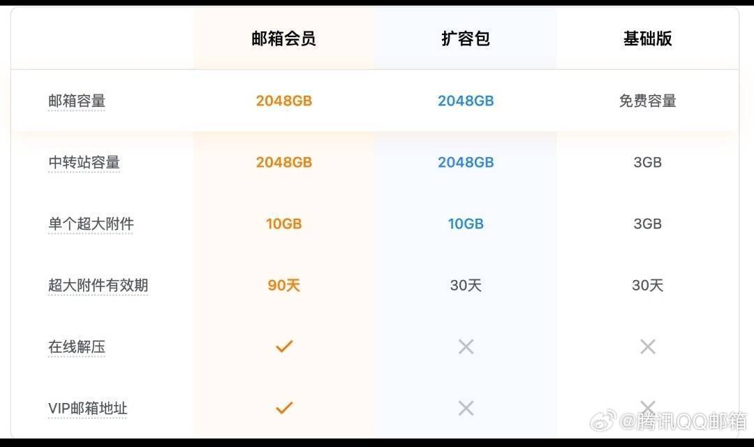 记者对比发现,QQ邮箱推出的会员付费服务,包括邮箱容量2048G、中转站容量2048G、中转站单个超大附件10G等容量扩容服务,以及中转站超大附件90天有效期、在线解压、VIP邮箱地址等增值服务。而其免费邮箱服务仍然保留,中转站容量为3GB,单个附件也只支持3GB,附件有效期为30天。同时,用户依然可以根据需求定时免费为自己的邮箱容量扩容。