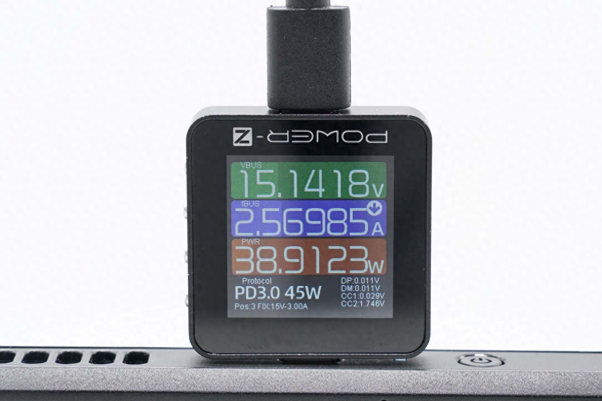 首先,通过原装45W充电器对 SteamDeck 游戏机进行充电,实测游戏机 USB-C 端输入功率为 15.14V 2.57A 38.91W。