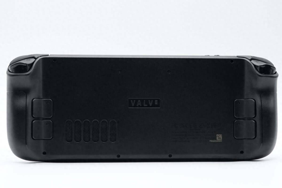 Steam Deck游戏机背面拥有左右各两侧自定义背键,拥有更高的自定义性;中间凸印 VALVE 品牌名称字样以及左下角的扬声器区域;右下角为丝印参数铭文。