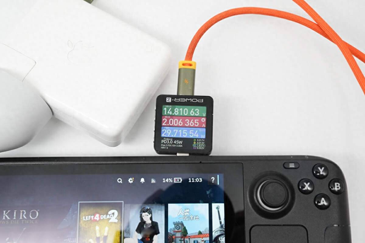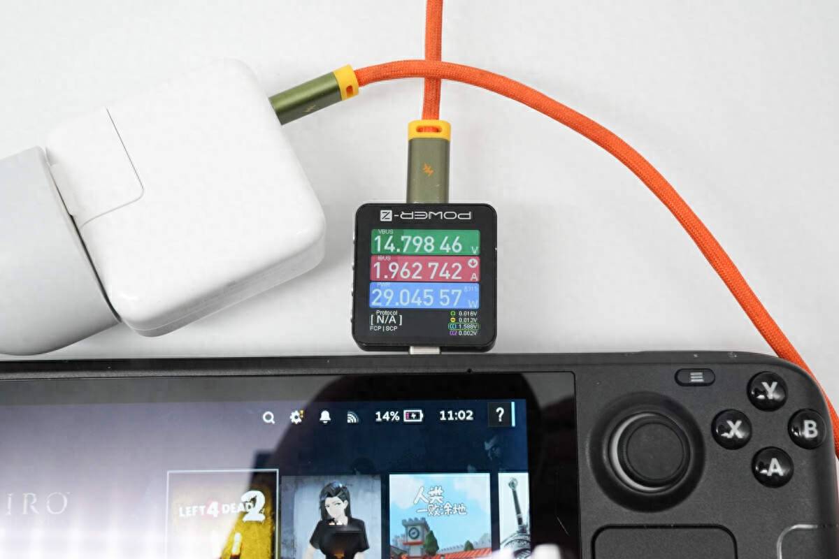 通过苹果35W充电器对 SteamDeck 游戏机进行充电,实测游戏机 USB-C 端输入功率为 14.8V1.96A 29.05W。
