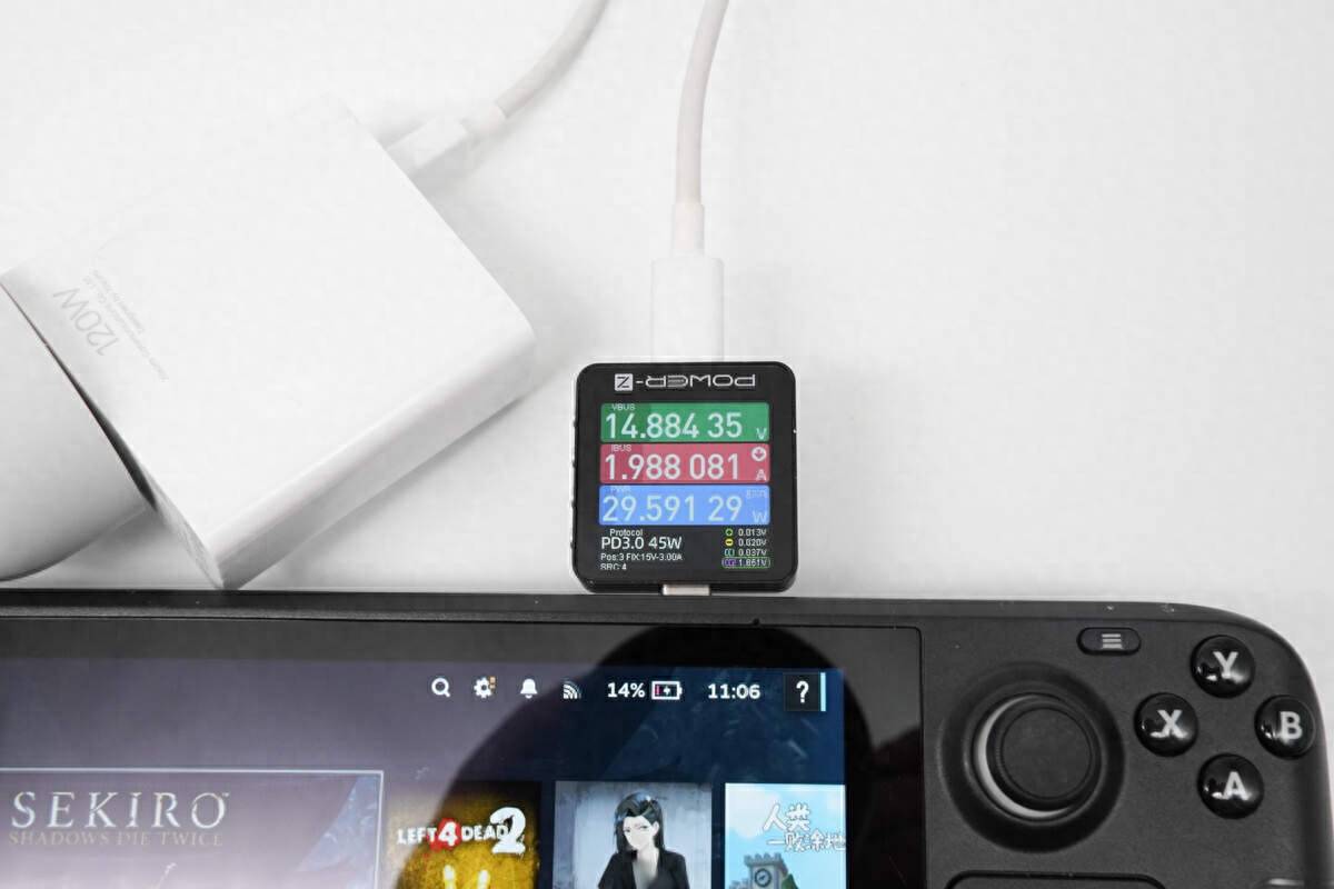 通过小米120W充电器对 SteamDeck 游戏机进行充电,实测游戏机 USB-C 端输入功率为 14.88V 1.99A 29.59W。