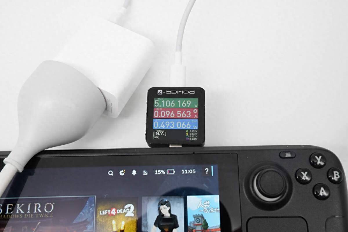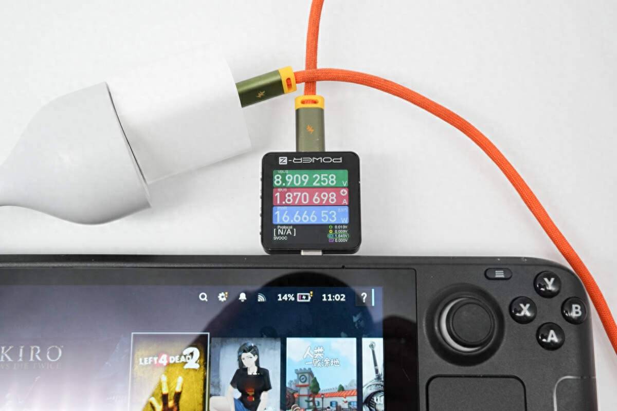 通过苹果20W充电器对 SteamDeck 游戏机进行充电,实测游戏机 USB-C 端输入功率为 8.91V 1.87A 16.67W。