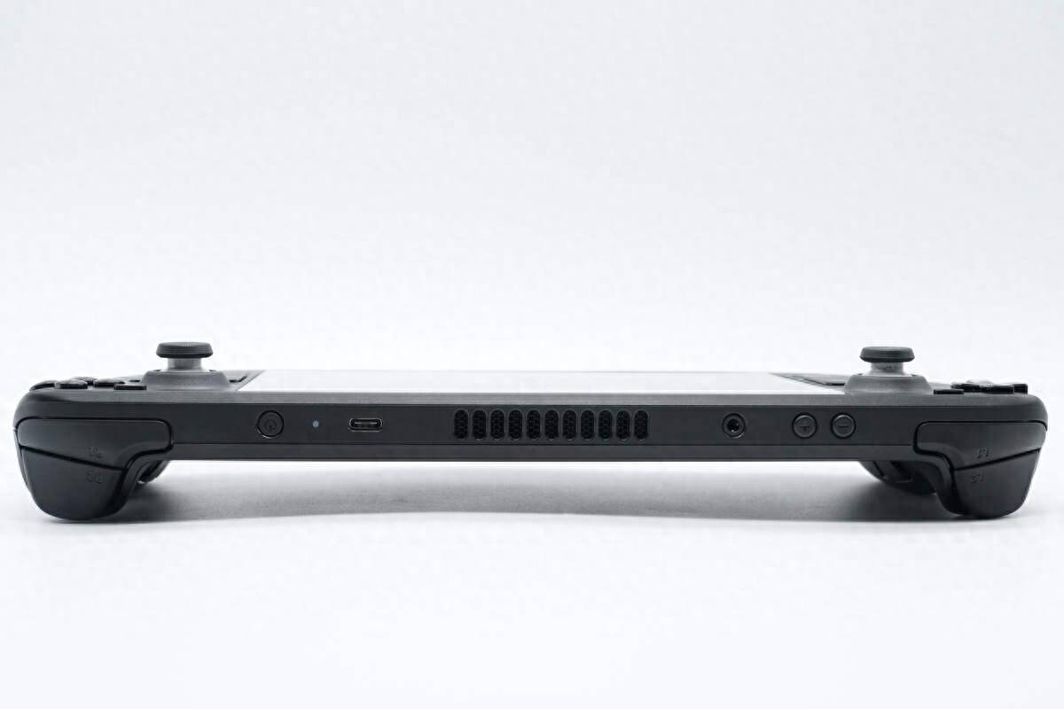 Steam Deck游戏机顶部从左到右依次为R1R2扳机、电源键、USB-C端口、网格型散热仓、3.5mm孔位、音量加减按钮以及L1L2扳机;其中扳机声音较为清脆,回弹反馈手感高级;并且实测时,USB-C端口支持数据传输、充电以及视频输出。