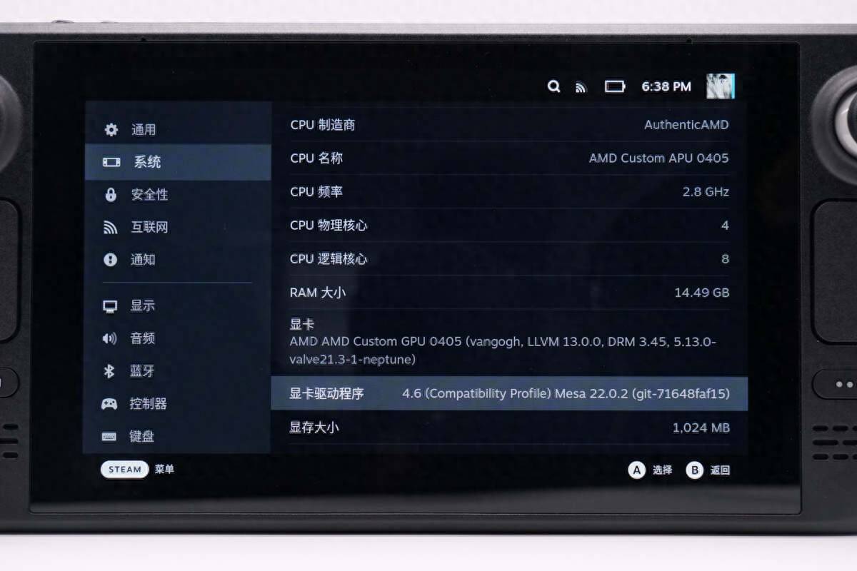 最后,调出Steam Deck游戏机的配置参数信息,可以看到处理器供应商为AMD,CPU为AMD Custom APU 0405,内存大小为14.49GB,显存大小为1024MB等等,在掌机之中无疑是高配机器之一。