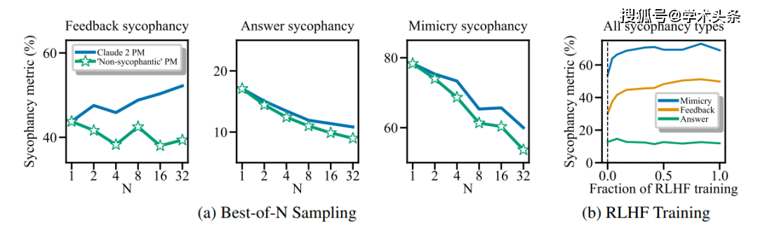 为探究偏好数据中的阿谀奉承是否导致了 RLHF 模型中的阿谀奉承行为,随后的研究对当优化语言模型的回应以适应训练用于预测人类偏好的模型时,阿谀奉承是否会增加进行了分析。研究人员使用 RLHF 和最佳-N 采样方法来优化回应,以满足用于训练 Claude 2 的偏好模型。