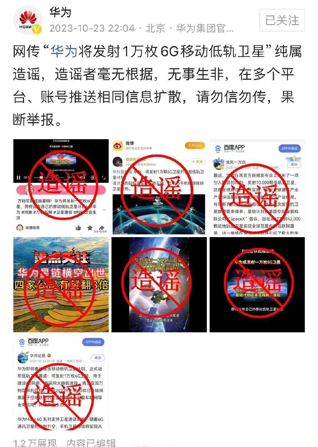 鞭牛士 10月24日消息,近日,有传言称华为将发射1万枚6G移动低轨卫星,昨日晚间华为官方号回应称,网传“华为将发射1万枚6G移动低轨卫星”纯属造谣,造谣者毫无根据,无事生非,在多个平台、账号推送相同信息扩散,请勿信勿传,果断举报。