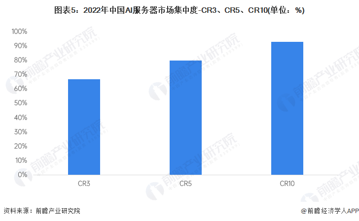 总体来看,我国AI服务器行业的市场集中度较高。2022年,我国AI服务器行业前三家企业营业收入集中度达67%,前五家企业营业收入集中度位80%,前十家企业营业收入集中度为93%,市场份额集中于龙头企业。