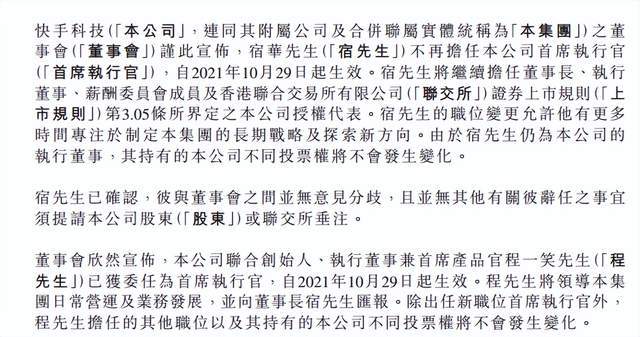 2021年10月份,快手宣布宿华不再担任CEO一职,继续担任董事长、执行董事、薪酬委员会委员,负责制定公司长期战略。