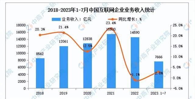 中商产业研究院披露的数据显示,2018年、2019年、2020年、2021年、2022年、2023年1月-7月,中国互联网企业业务收入同比增速分别为20.3%、21.4%、12.5%、23.4%、-1.1%、2.8%。