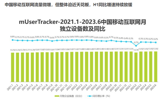 从国内互联网用户规模来看,截至2022年6月,中国网民数达10.51亿人,互联网渗透率达74.4%。另据艾瑞咨询提供的研究报告显示,截至2023年6月,中国移动互联网流量微增,但整体迫近天花板。