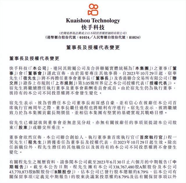 10月20日,快手公告称,自2023年10月29日起,宿华不再担任董事会董事长,理由是“需要专注其他事务”。宿华表示,“将继续致力于为集团创造长期价值,并相信集团有坚实的基础实现战略目标”。
